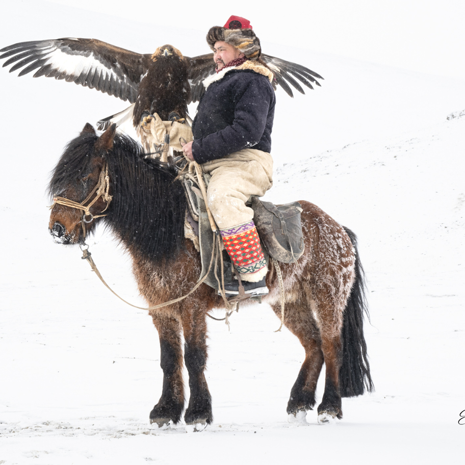 In this striking image, a Kazakh eagle hunter sits astride his hardy Mongolian horse in the depths of winter, his golden eagle perched with wings spread wide against the snow-laden landscape. The hunter, bundled in traditional winter gear against the brutal cold, occupies that liminal space between the terrestrial world of his sure-footed steed and snow below, and the aerial domain of the eagle above. He bridges two worlds, mediating between earth-bound and sky-born power in a partnership that has endured through countless harsh seasons. The photograph captures an ancient tradition where trust and mutual respect have forged an extraordinary bond between human and raptor in one of the world's most unforgiving environments.