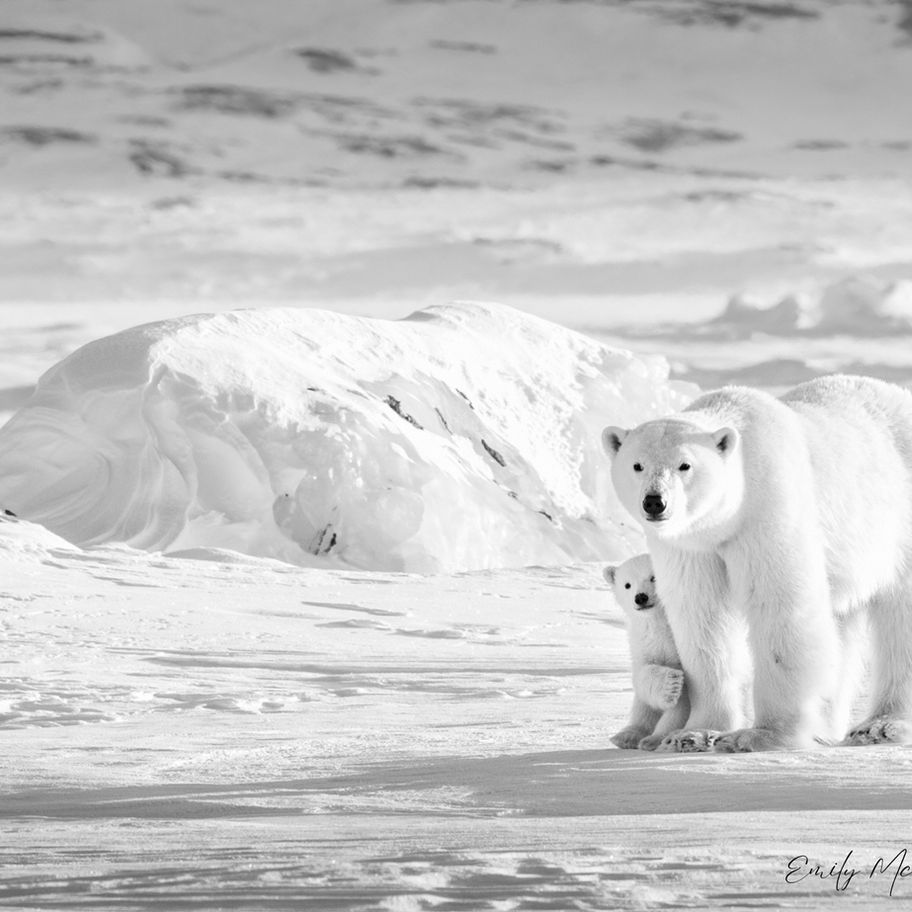 A tender moment between polar bear mother and cub against the stark white Arctic landscape. Through this captured moment, you sense both the innate curiosity and playful exploration of the young cub alongside the steady, protective presence of the mother's wisdom and instinct. Their protective embrace mirrors the bonds we recognize in ourselves. As they navigate a world where ice and sky blend into infinity, we empathize with this profound expression of connection.