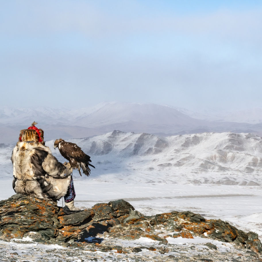 Against the vast white expanse of Mongolia's winter mountains, a hunter and his golden eagle, Ana, sit motionless above a winter world. Mountains fade to white horizon as both gaze outward while looking inward.